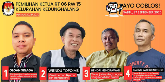 Bogor – Warga RT 006 RW 015 Villa Bogor Indah 3 kini resmi memiliki ketua RT baru setelah pemilihan yang berlangsung secara demokratis, 27 September 2025. Bapak Windu topo salah satu calon, berhasil unggul atas 3 rivalnya (Oloan Sinaga , Hendri Hendrawan Cahyo jati kumoro ) dengan perolehan 43 suara dari total 141 Kepala Keluarga (KK) yang mengikuti pemungutan suara di Fasum RT.006 RW.015