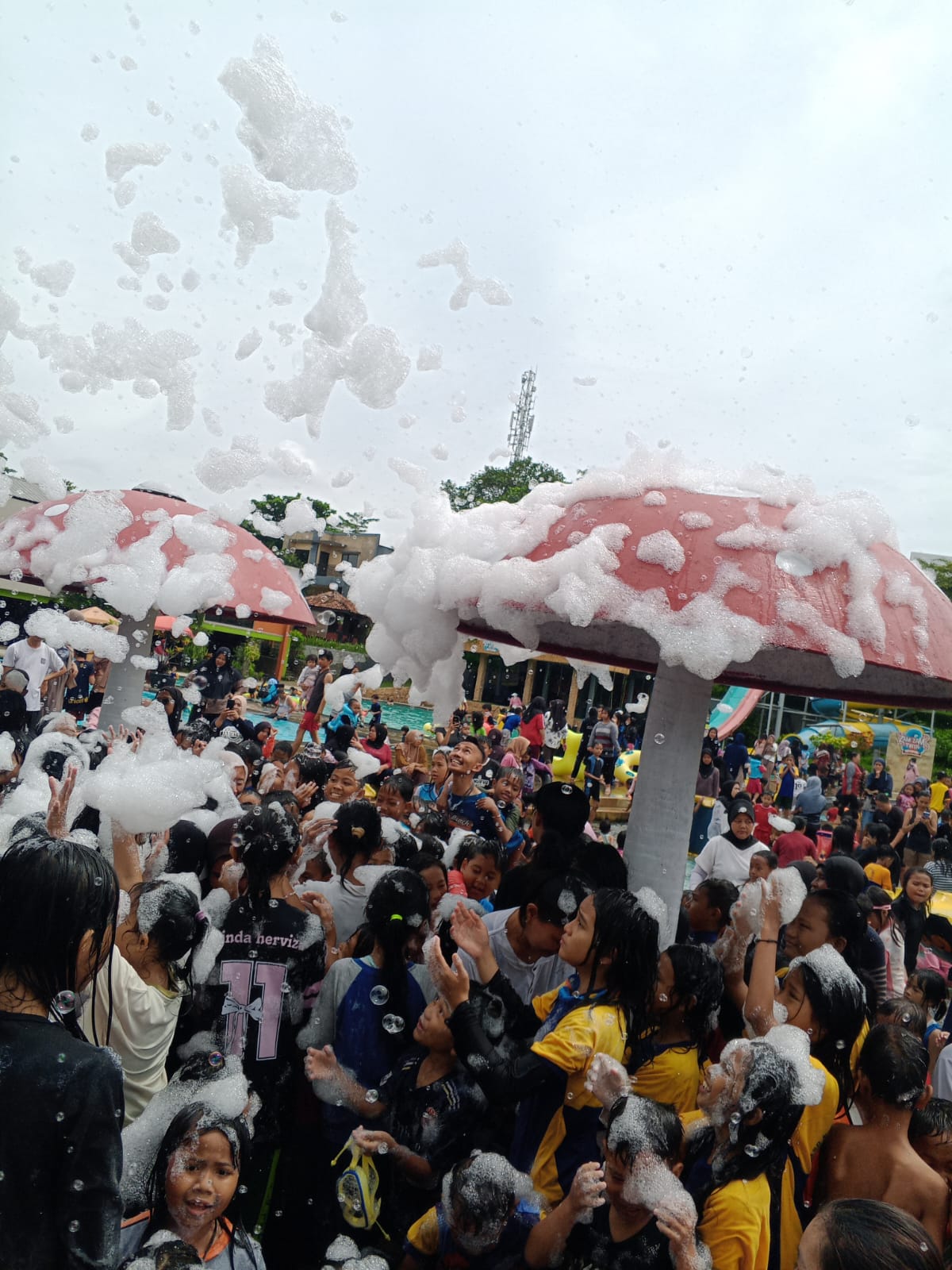 Suasana di lokasi tampak ramai dan penuh tawa. Anak-anak berlarian di kolam busa, sebagian lagi mencoba perosotan spiral dan kolam arus. Di tepi kolam, orang tua sibuk memotret sambil sesekali ikut tertawa melihat keceriaan anak-anak mereka.