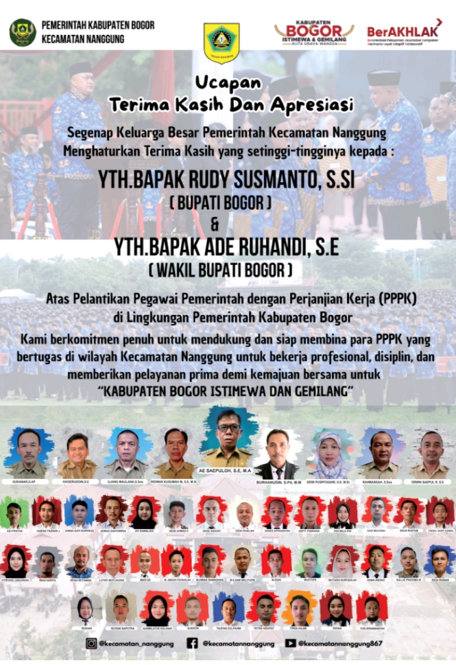 Untuk itu, Camat Nanggung mengucapkan rasa terimakasihnya pada Bupati Bogor Rudy Susmanto dan Wakil Ade Ruhandi serta jajarannya atas dilantiknyanya PPPK yang merupakan pekerja di Kantor Kecamatan Nanggung.