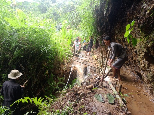 Para petani di Kelompok Tani (Poktan) Berkah Jaya di Desa Batutulis, Nanggung, Kabupaten Bogor melakukan gotong-royong memperbaiki saluran irigasi yang jebol.